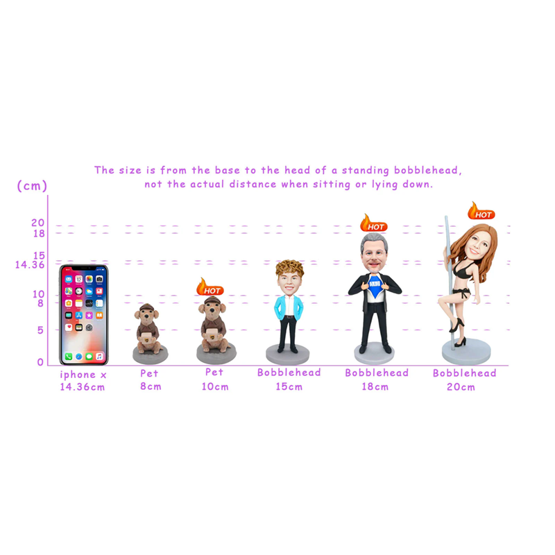 The size is from the base to the head of a standing bobblehead, not the actual distance when sitting or lying down. The most popular sizes are 18cm (about 7 inches) and 20cm (about 8 inches).